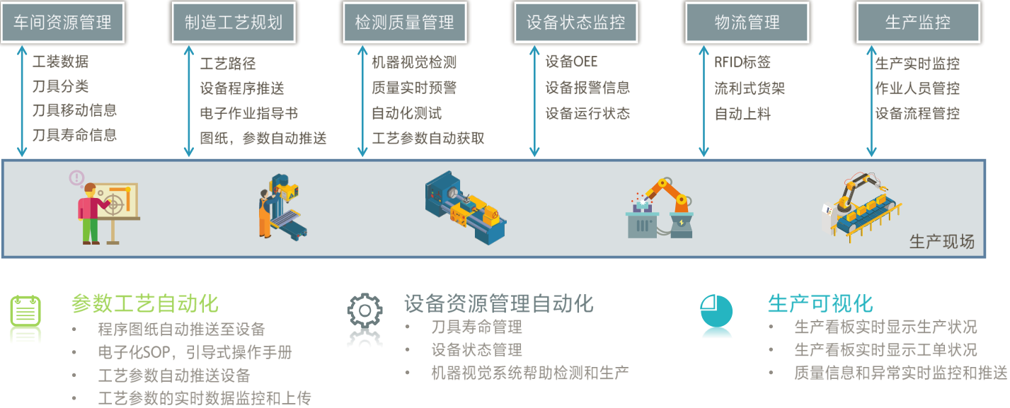 生產:數據自動收集,實現無紙化,減少錄入錯誤,生產強制流程管控,OEE,設備監(jiān)控,計劃排程